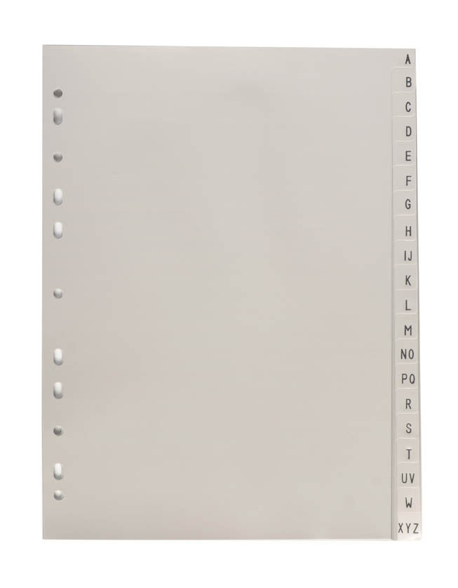 šedé plastové rozdružovače z polypropylenu (120mic) pro číselné nebo abecední třídění, multiperforace umožňuje založení rejstříku do kroužkového i pákového pořadače