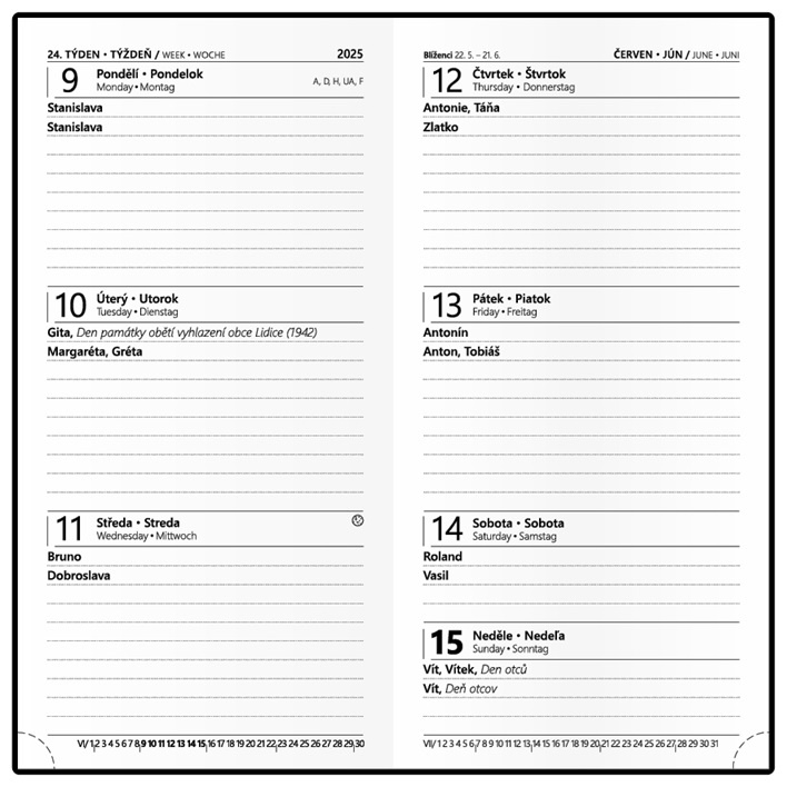 povrch diáře příjemný na dotek, zářivé barvy, moderní design, české a slovenské jmenné kalendárium, dny a měsíce v 5 jazycích (CZ, SK,