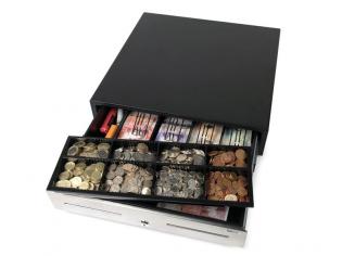 Pokladní přihrádka s pevnou kovovou konstrukcí. Kompatibilní s pokladními tiskárnami a registračními pokladnami RJ12 (12 V / 24 V).
