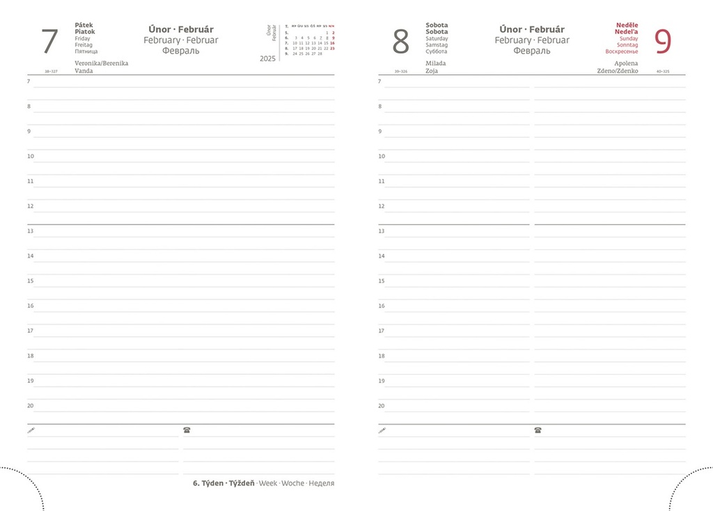 povrch diáře příjemný na dotek, zářivé barvy, moderní design, české a slovenské jmenné kalendárium, dny a měsíce v 5 jazycích (CZ, SK,