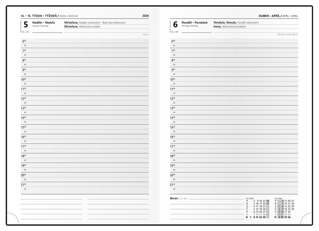 povrch diáře příjemný na dotek, zářivé barvy, moderní design, české a slovenské jmenné kalendárium, dny a měsíce v 5 jazycích (CZ, SK,
