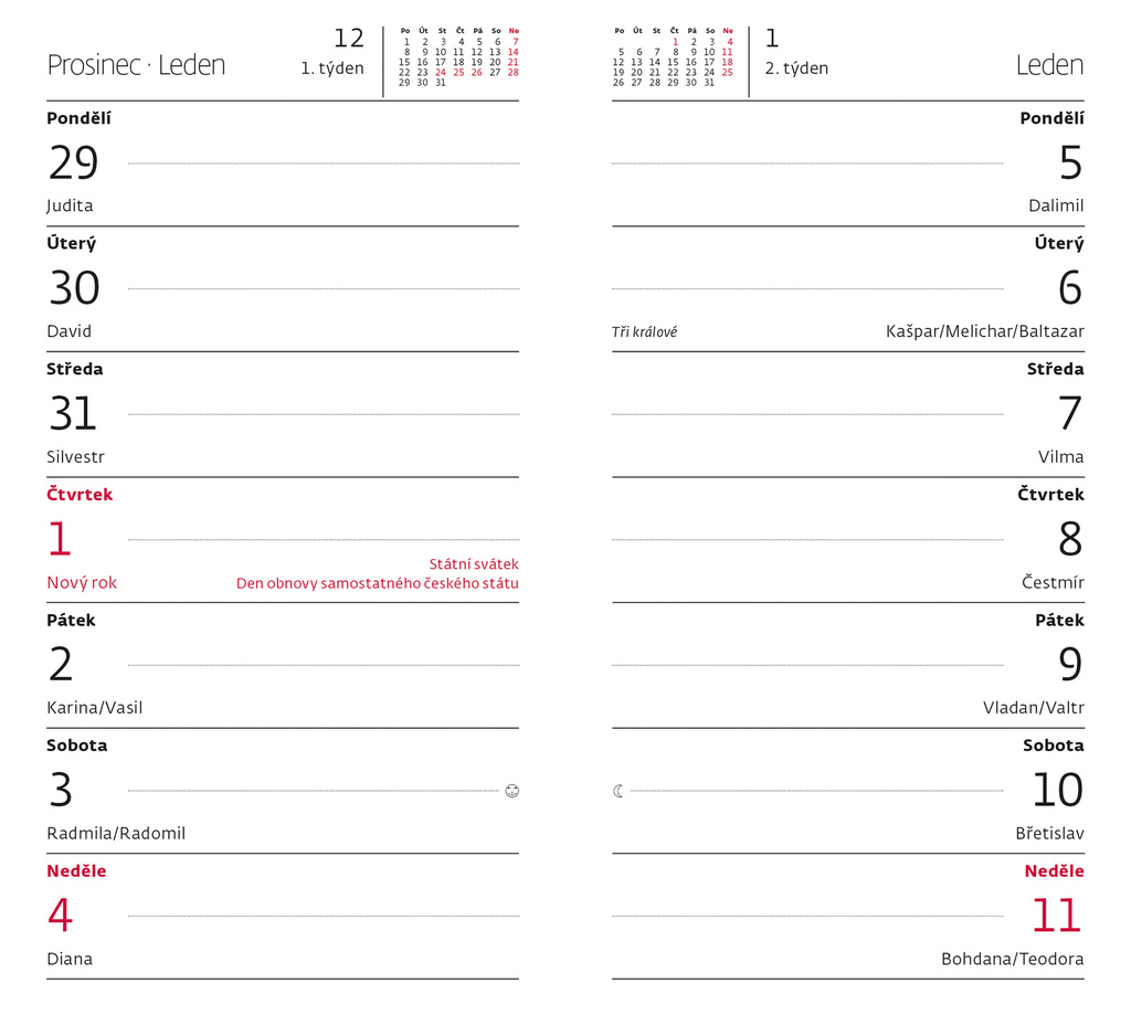 materiál lamino v moderním barevném provedení, 14 denní české jmenné kalendárium, 80 stran, formát 9 x 15 cm