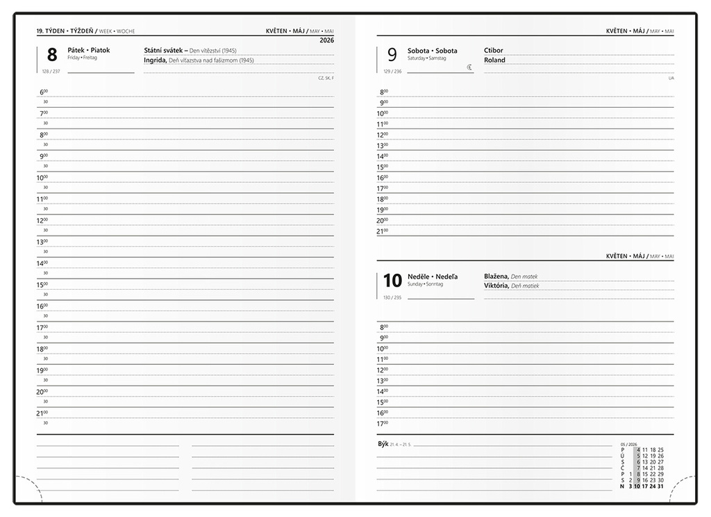 plnobarevné diáře potažené nepoškrabatelným matným laminem s parciálním lakem, rovný hřbet, české a slovenské jmenné kalendárium, dny a měsíce v 5 jazycích (CZ, SK, ANG, D, R), mezinárodní svátky, měsíční fáze, roční období, letní a zimní čas, místo na poznámky