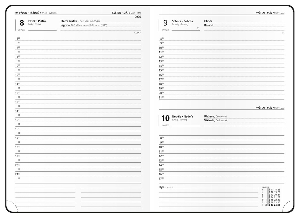 jemný materiál (imitace semiše), jednostranná výplň desek, ražba roku, rovný hřbet, zakulacené rohy, české a slovenské jmenné kalendárium, dny a měsíce v 5 jazycích (CZ, SK, ANG, D, R), mezinárodní svátky, měsíční fáze, roční období, letní a zimní čas, místo na poznámky