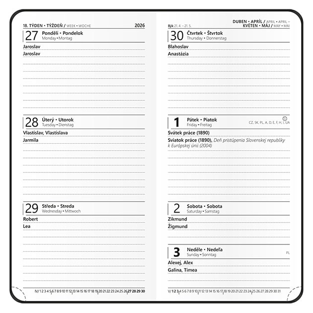 jemný materiál (imitace semiše), jednostranná výplň desek, ražba roku, rovný hřbet, zakulacené rohy, české a slovenské jmenné kalendárium, dny a měsíce v 5 jazycích (CZ, SK, ANG, D, R), mezinárodní svátky, měsíční fáze, roční období, letní a zimní čas, místo na poznámky