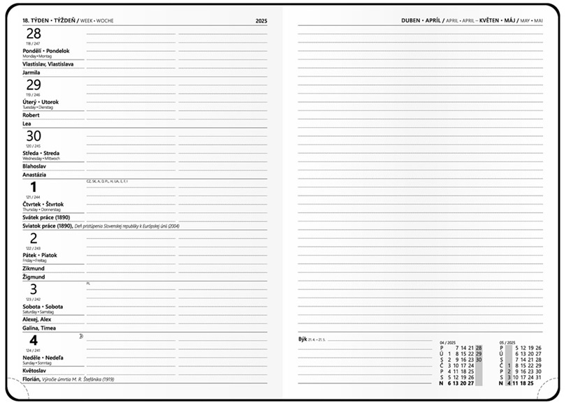 strukturovaný materiál s lesklým povrchem, ražba roku, jednostranná pěnová výplň desek, rovný hřbet, české a slovenské jmenné kalendárium, dny a měsíce v 5 jazycích (CZ, SK, ANG, D, R), mezinárodní svátky, měsíční fáze, roční období, letní a zimní čas, místo na poznámky
