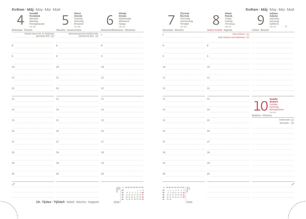 příjemná lamino úprava, mezinárodní svátky, plánovací kalendář, osobní údaje, měsíční přehled, adresář, mapa Evropy a České a Slovenské