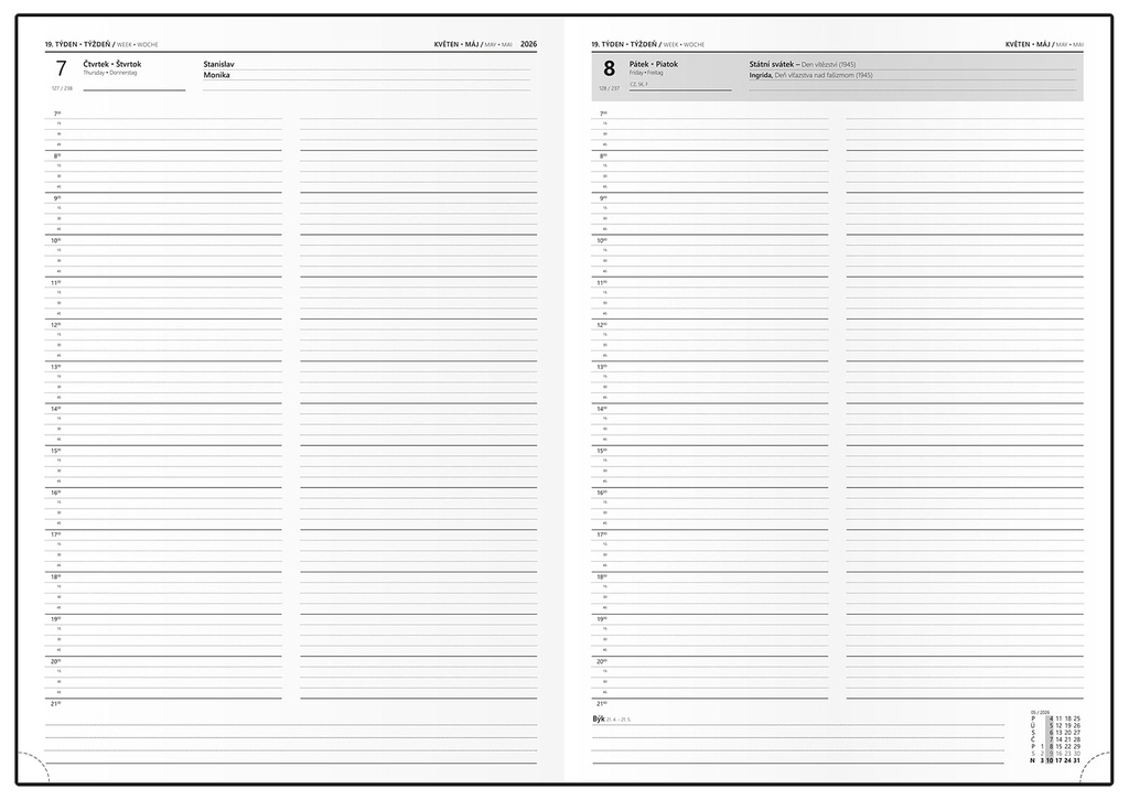 povrch diáře příjemný na dotek, zářivé barvy, moderní design, české a slovenské jmenné kalendárium, dny a měsíce v 5 jazycích (CZ, SK,