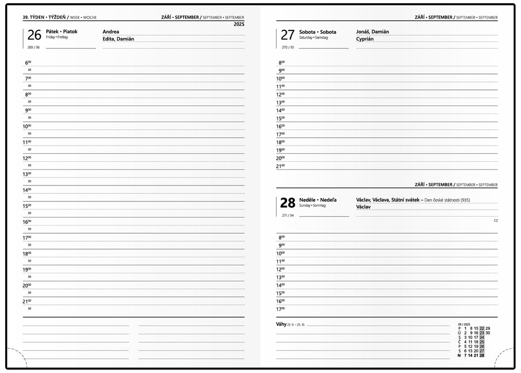 povrch diáře příjemný na dotek, zářivé barvy, moderní design, české a slovenské jmenné kalendárium, dny a měsíce v 5 jazycích (CZ, SK,