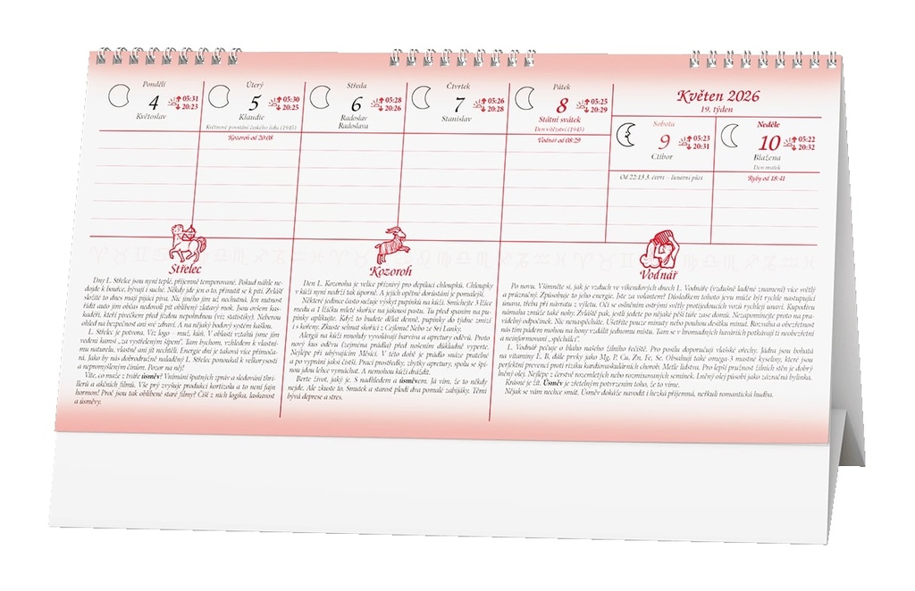 české týdenní jmenné kalendárium, měsíční fáze, roční období, letní a zimní čas, čas východů a západů slunce, formát 30 x 15 cm, 57