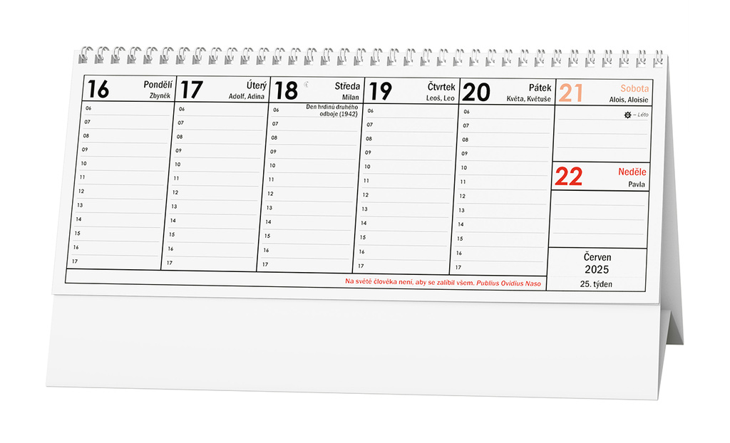 nejprodávanější pracovní kalendář, české týdenní jmenné kalendárium, měsíční fáze, roční období, zimní a letní čas, doplněný citátem na