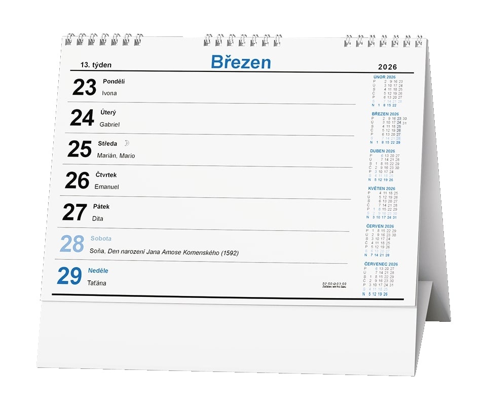 české týdenní jmenné kalendárium, měsíční fáze, roční období, letní a zimní čas, formát 21 x 15 cm, 57