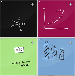 Skleněné tabule mají zaoblené rohy, které je činí bezpečnější při používání. STÍRATELNÉ vlastnosti umožňují dělat si poznámky nebo malůvky a zase je okamžitě změnit, kdykoliv budete potřebovat.