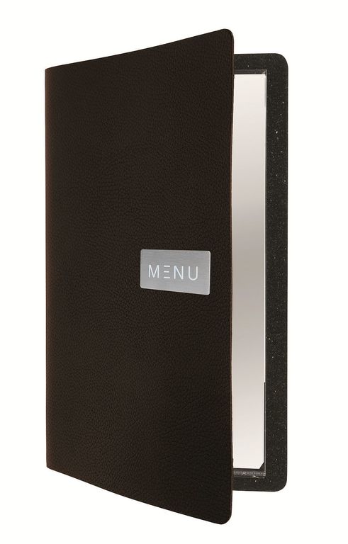 Moderní elegantní desky na jídelní lístky z lepené kůže s vyměnitelnými vložkami. Desky jsou označeny kovovým štítkem s nápisem MENU. Ke každému kusu je přibalen prázdný samolepící kovový štítek. Pokud chce zákazník produkt personifikovat, může na štítek nechat vyrazit název nebo logo restaurace a přelepit jím stávající štítek. Desén: hnědá kůže s hrubší strukturou.